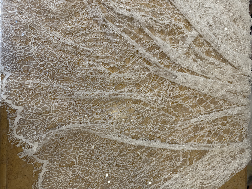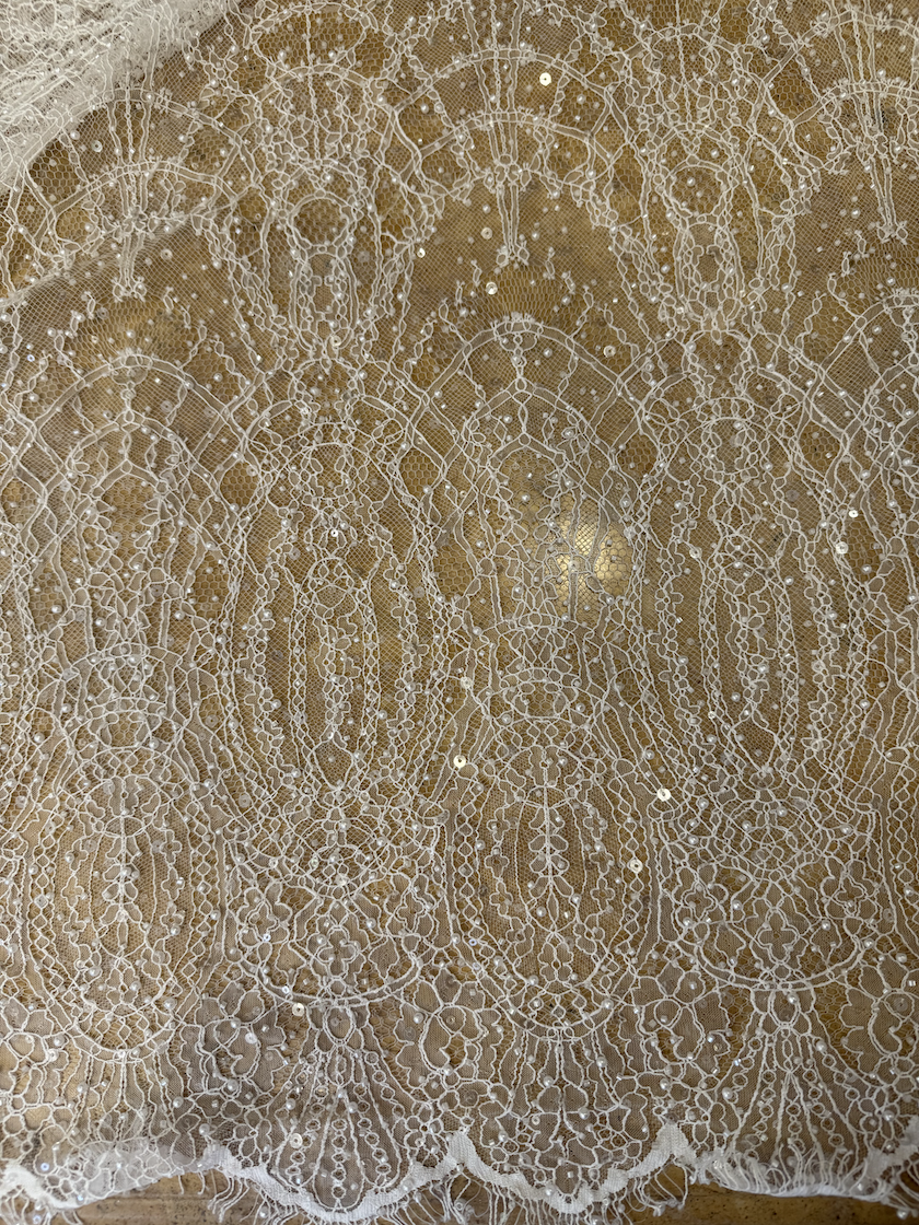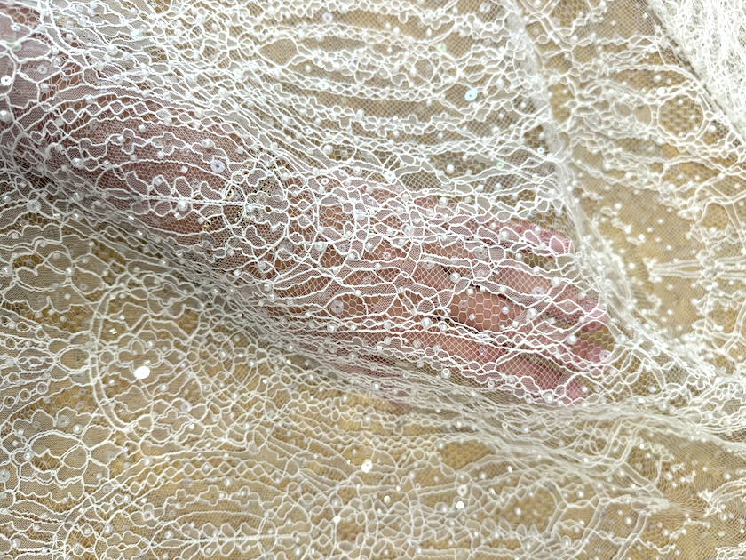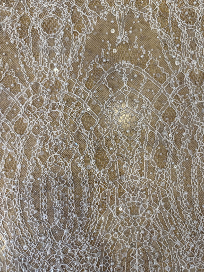Δαντέλα σαντιγί με γραμμικό σχεδιο σε χρώμα off-white,με κεντημένες μικρές και διακριτικές πέρλες. Ένα ιδιαίτερο κομμάτι, με φάρδος 1,50 κατάλληλη για εντυπωσιακά νυφικά.