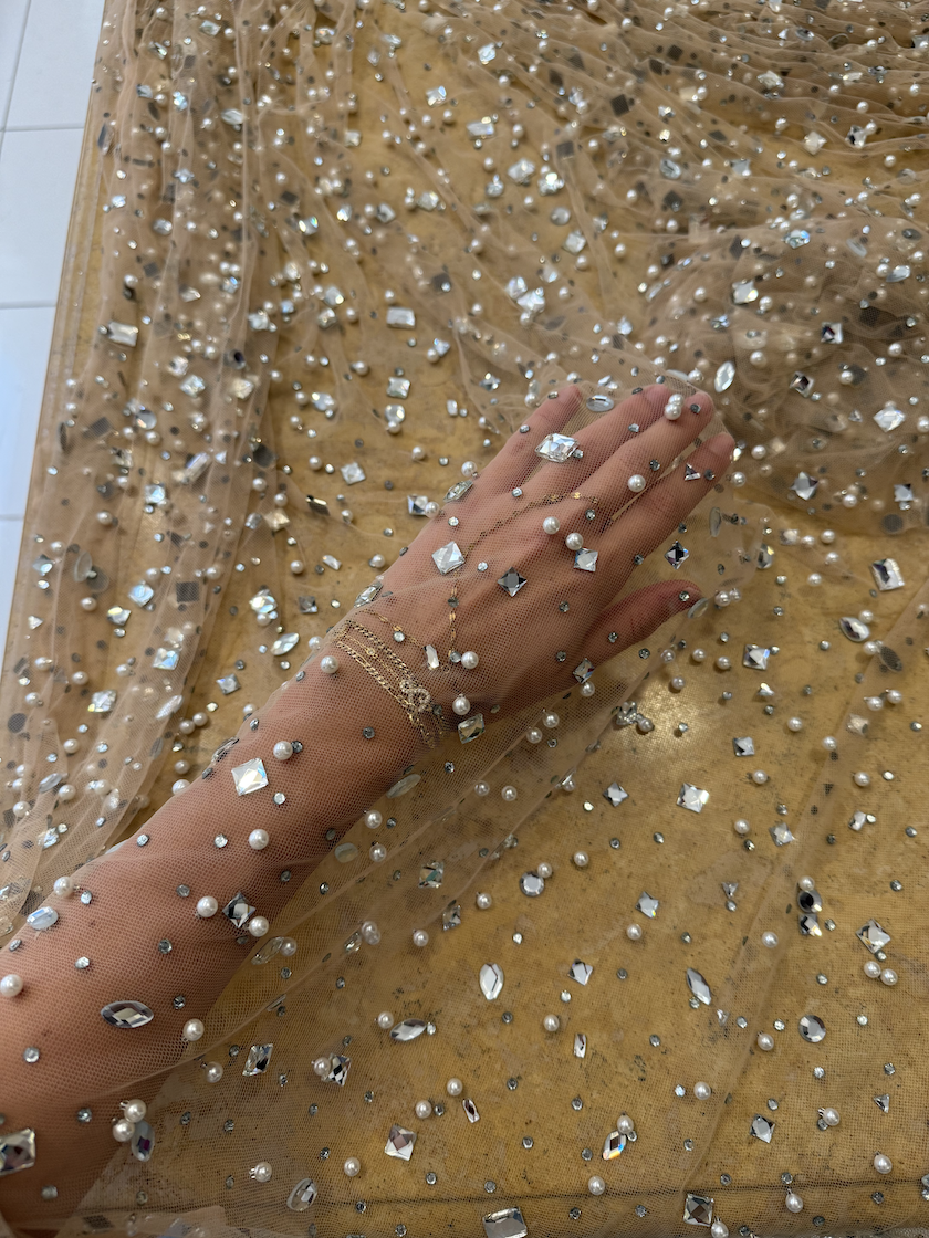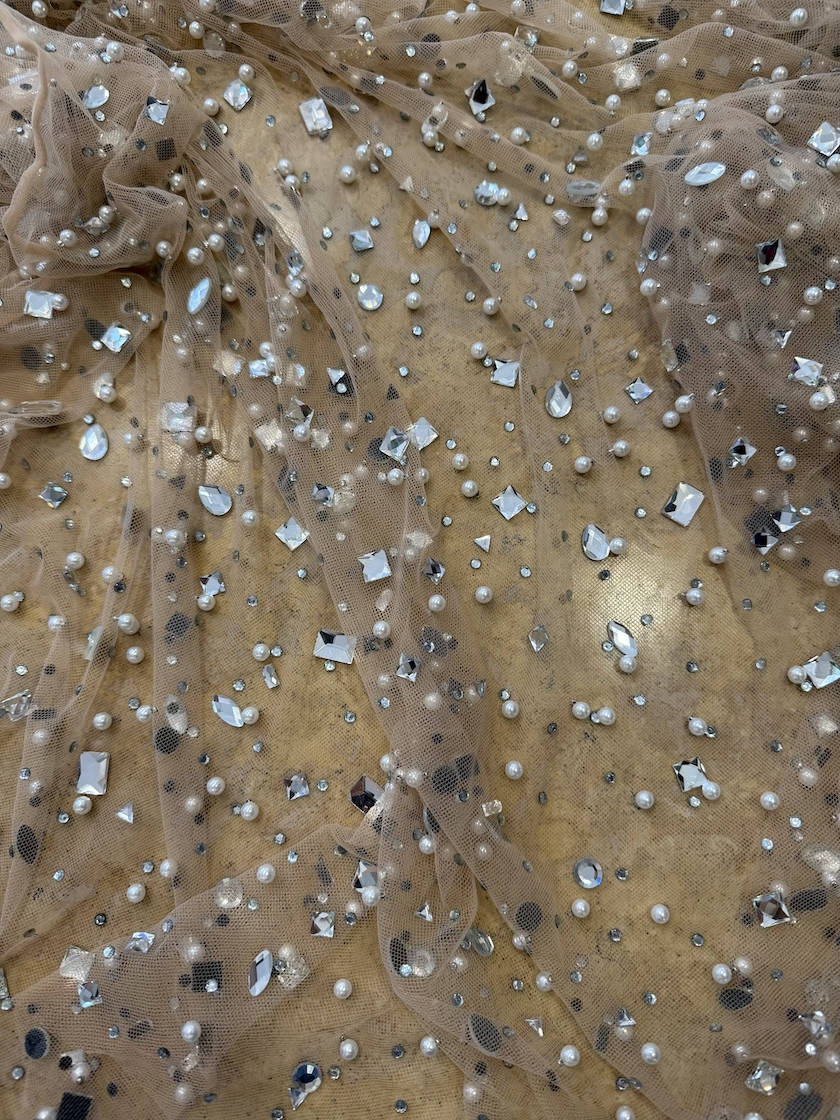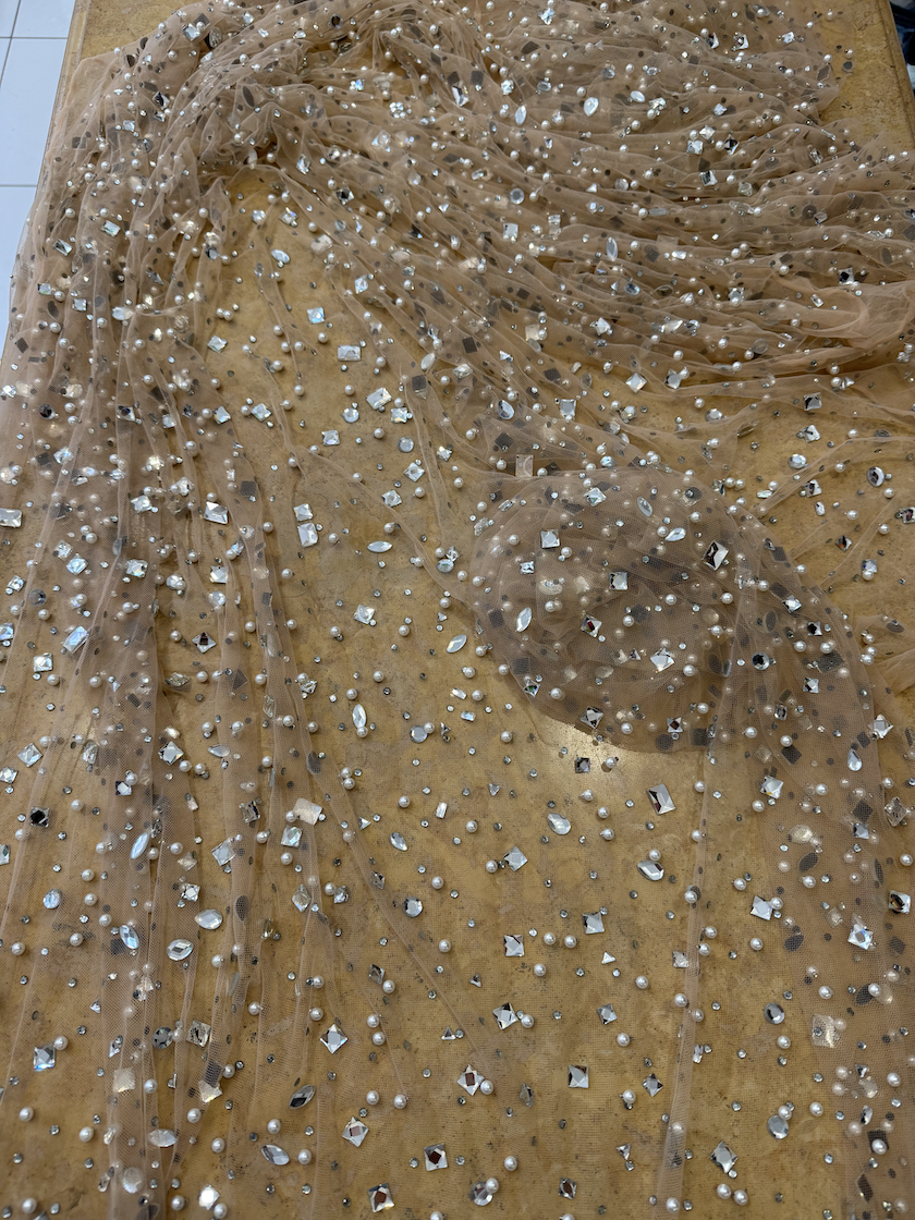 Τούλι σε χρώμα δέρματος/ μπεζ , κεντημένο με πέρλα και πέτρες (η πέρλα είναι σε χρώμα λευκό), κάνει ντεγκραντε σχέδιο. Το φάρδος του είναι 1,50 και είναι κατάλληλο για βραδινό φόρεμα και φούστα.